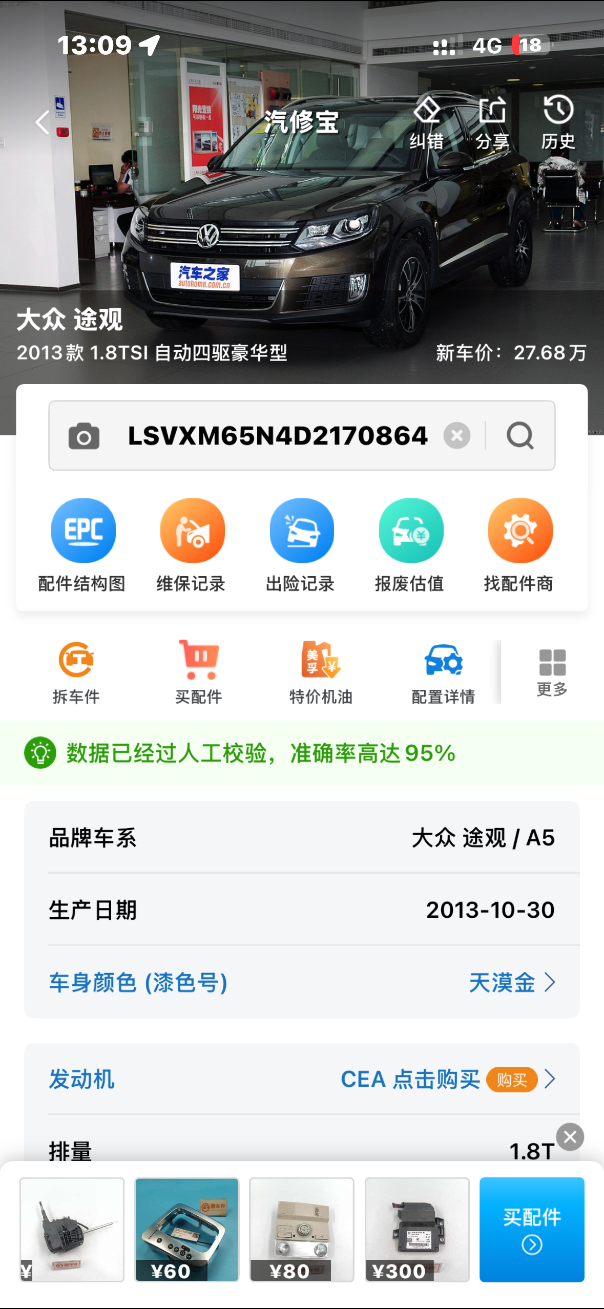 2013款 大众 途观 左外后视镜 前头总成 后幅总成 车顶总成 左纵梁 右纵梁 前嘴 机盖 左前翼子板 右前翼子板 左前大灯 右前大灯 其他车壳件 左侧围 右侧围 右外后视镜 发动机 变速箱 发动机电脑 变速箱电脑 ABS泵 进气歧管 发电机 元宝梁 半轴 减震器 方向机 轮毂带轮胎 电子方向立柱 工作台 主副气囊 仪表 气囊电脑 发动机线束 换挡机构 中央通道扶手箱 主驾驶座椅 副驾驶座椅 后排坐垫靠背 天窗 后盖 左前门 左后门 右前门 右后门 后桥 分动箱 差速器 传动轴 其他外观 其他动力/变速/制动件 其他底盘件 变速箱 左后尾灯 右后尾灯 踏板 拉杆 四驱系统 中控屏 前挡风玻璃 后挡风玻璃 其他机械件 其他内饰件 事故车 滤芯 空调 马达 中网 前保险杠 后保险杠 后备箱盖 油箱盖 外门把手 胶条 动力电池 驱动电机 电控系统