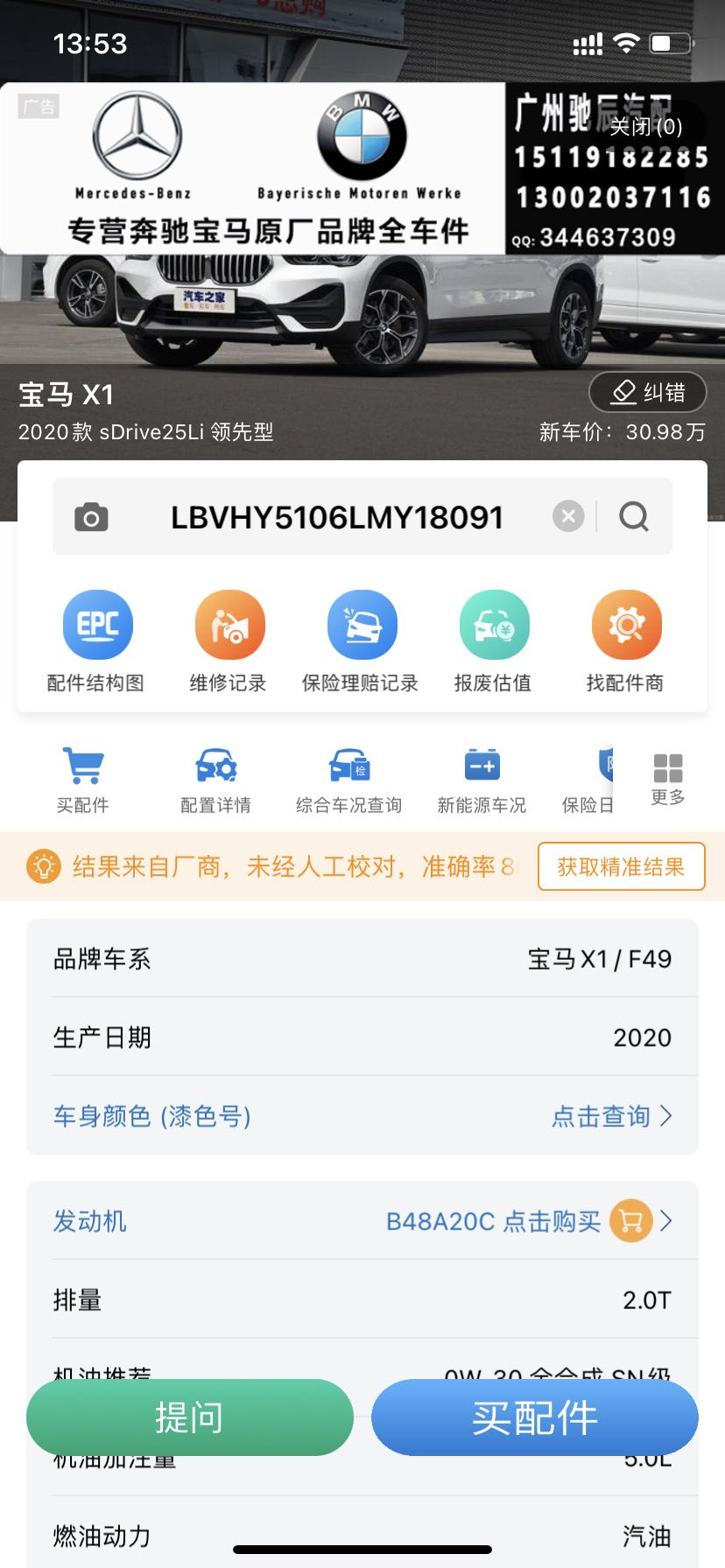 2020款 宝马 X1 左外后视镜 右前大灯 其他车壳件 后盖 左前门 左后门 右前门 右后门